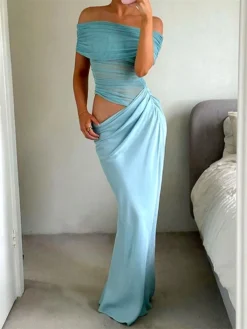 Women Long Dress Solid Color Boat Neck Off Shoulder Dress Summer Fashion Bodycon Dress